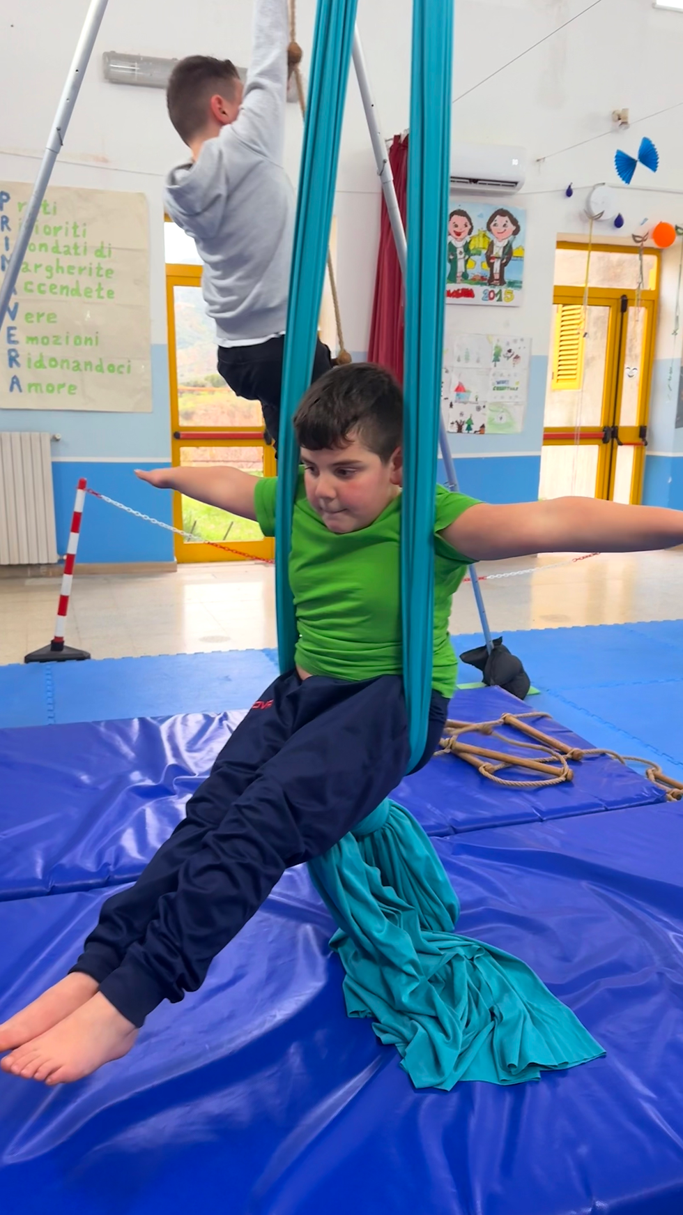 La prima fiducia è verso sé stessi. Quando un bambino guarda il tessuto dall’alto in basso, la vera sfida non è fisica, è interiore: “Sarò capace?”. Ogni piccolo avanzamento — un nodo riuscito, un secondo in più sospesi — diventa una risposta concreta a quella domanda. Il corpo dimostra ciò che la mente ancora dubita.
